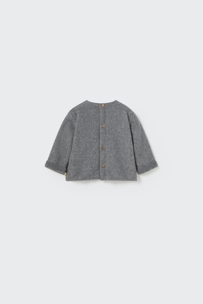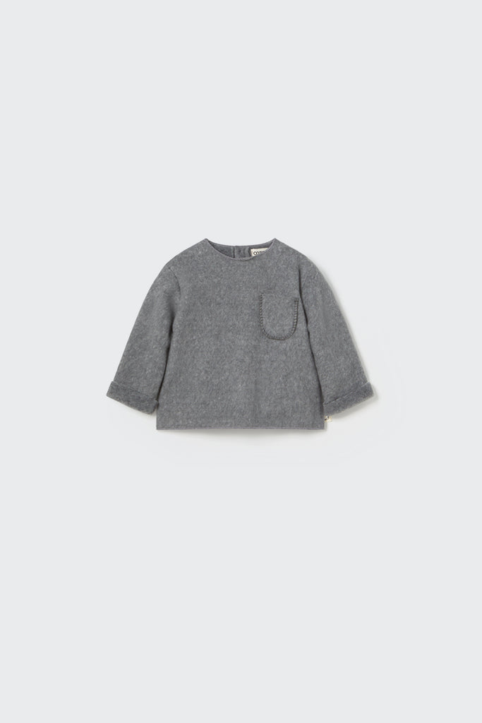 Soft mélange bamboo sweater with folded cuffs and front pocket detail. Buttoned at back.