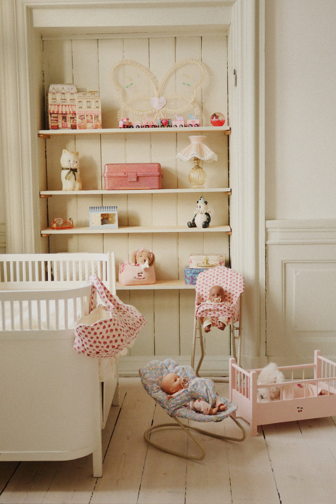 Padded doll lift designed with practical carry straps, soft piping and scallop shaped endings.