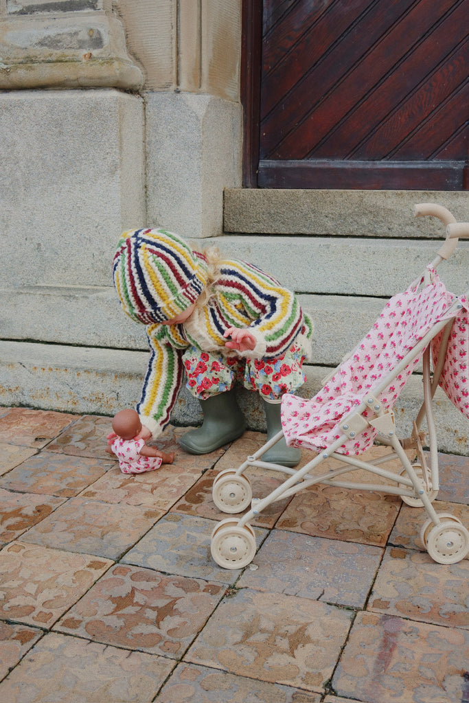 Doll stroller designed with a harness, carriage bag and double wheels on all four legs for extra stability. Features removable fabric made in 100 percent organic cotton. Comes fully assembled. Easy to fold and store. The frame is made of iron with soft and spongy EVA material at the handles.